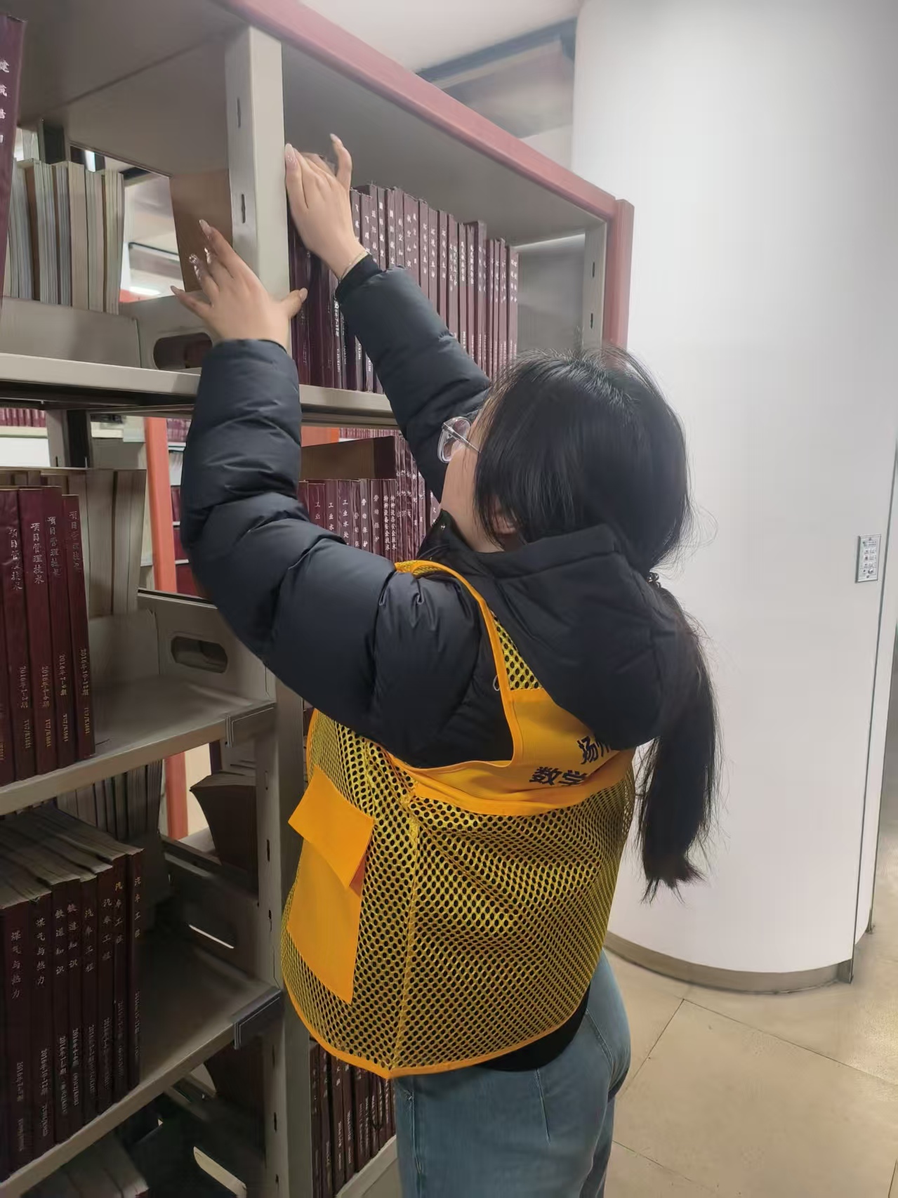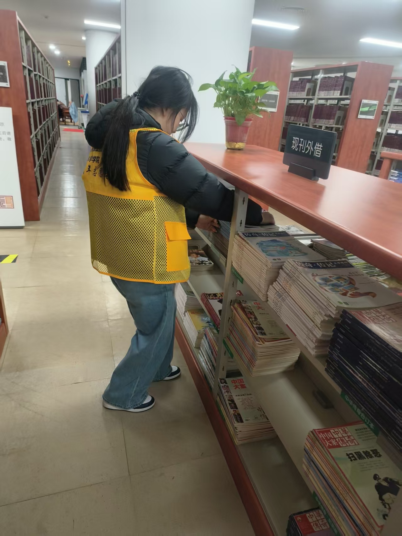 在藏书架间,志愿者们化身为“图书管理员”。面对部分读者归架错误的图书,他们运用在学院专业课中培养的严谨逻辑思维,仔细核对索书号,将一本本“迷路”的书籍准确送回“家”。针对馆内近期流通量较大的热门书籍和参考书目,志愿者们协助工作人员进行了细致的排架与整理,确保读者能够便捷地查找与借阅,极大地提升了阅览室的服务效率。